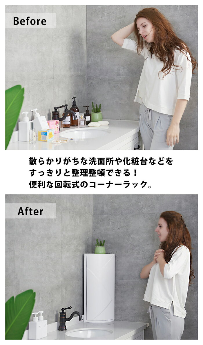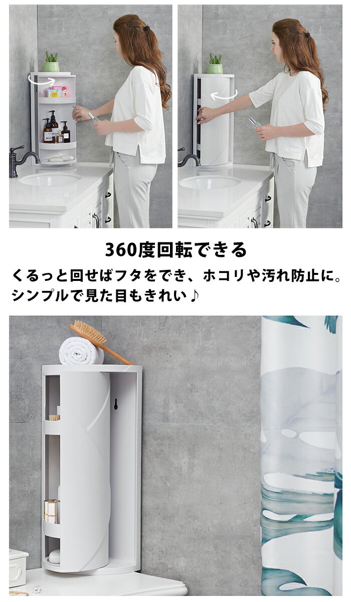 ■360度回転式 クルっと回してフタができるので、 ホコリや汚れ防止になり、 中身を隠せて見た目もきれい! ■コーナーに置ける コーナーにぴしゃりとハマる90度設計。